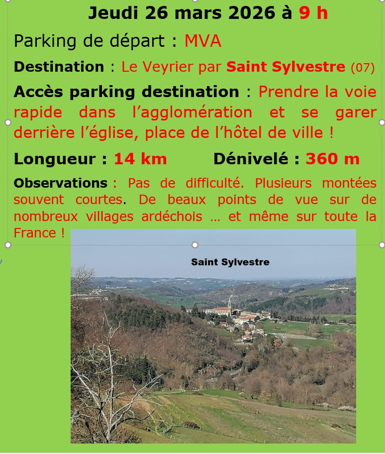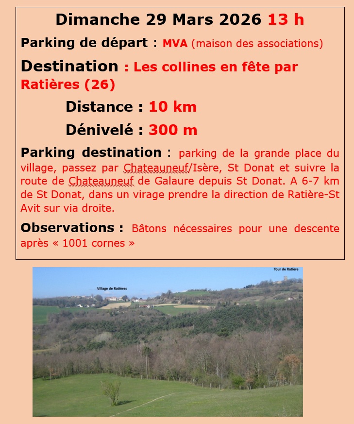 La sortie de dimanche 22 mars 2026 est annulée car les prévisions météo pour cette après-midi sont très défavorables pluie et risque d'orage annoncé par diverses météos.