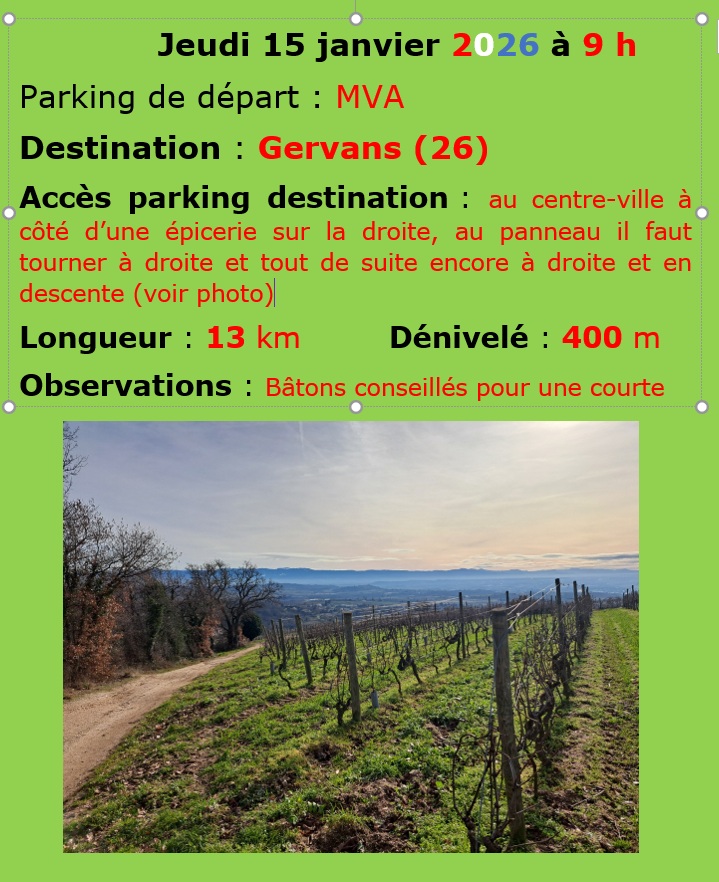 Si le jour d'une randonnée le temps est incertain mais qu'elle n'est pas annulée sur le site il est préférable de se rendre au départ de la Maison de la Vie Associative plutôt que d'aller directement sur le lieu de départ de la randonnée. (ou envoyer un mail sur rando-evasion@orange.fr)