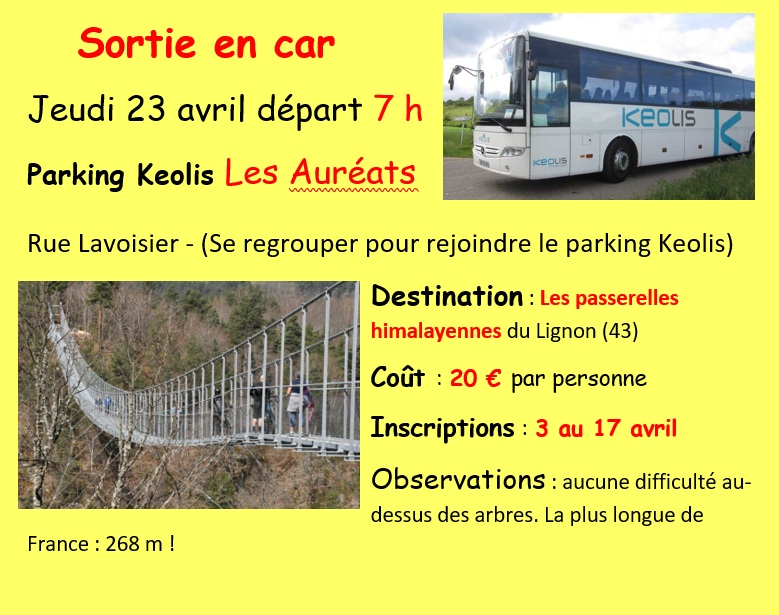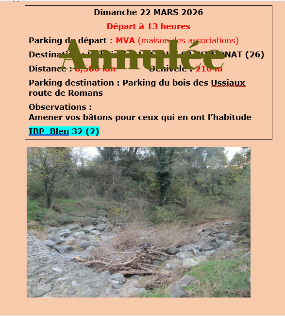 La sortie de dimanche 22 mars 2026 est annulée car les prévisions météo pour cette après-midi sont très défavorables pluie et risque d'orage annoncé par diverses météos.